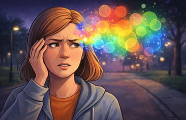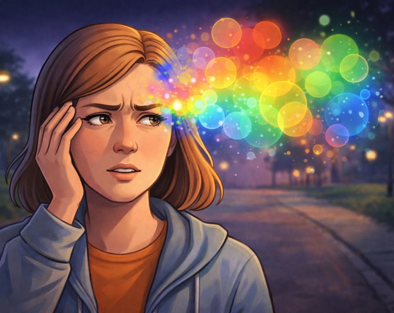 The sun had already dipped below the horizon, and streetlights were flickering on one by one. As she crossed the street, a burst of color flashed in the right side of her vision. At first, she thought it was a reflection from a passing car. But the lights did not behave like reflections. They formed bright, circular shapes, shimmering in reds and greens, pulsing like small fireworks inside her field of view.